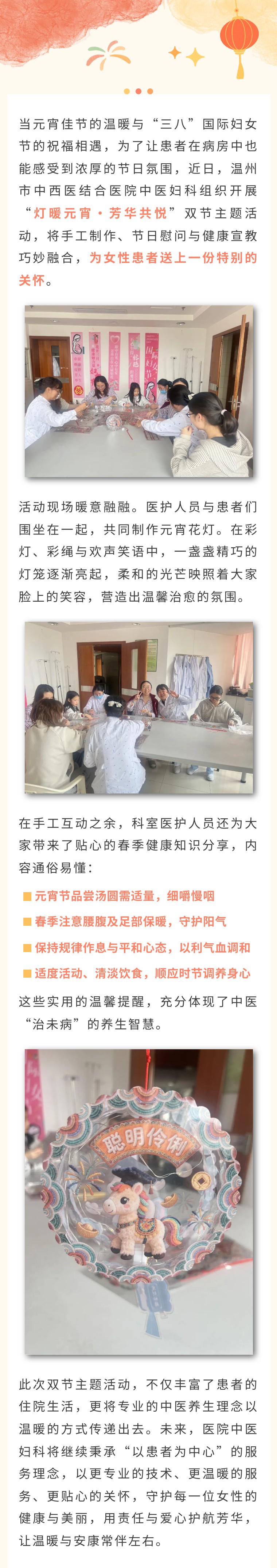 【东风健行】灯火可亲映笑颜 芳华如歌暖病房——温中西医中医妇科开展“灯暖元宵·芳华共悦”双节主题活动
