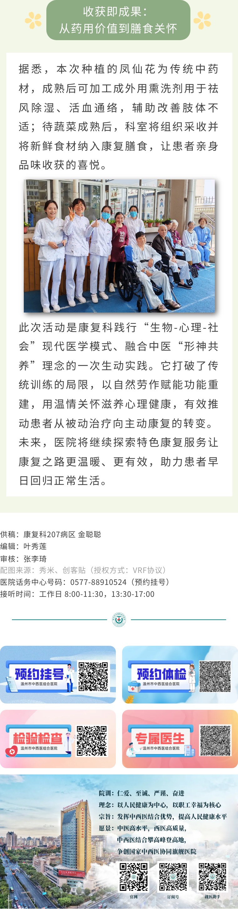 春日和暖,万物复苏。近日,温州市中西医结合医院康复科创新康复模式,将功能训练融入田间劳作,组织住院患者在科室专属的“共享菜田”中开展特色种植活动。通过亲手播种蔬菜与凤仙花种子,患者在指尖的精细操作与肢体的协调运动中完成康复训练,于躬身耕耘间播撒下康复的希望。