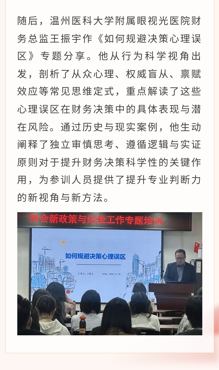 2025年11月28日,温州市中西医结合医院成功举办财会新政策与纪检工作专题培训,旨在精准把握财经政策新要求,强化关键岗位廉洁风险防控能力,保障医院资金与医保基金安全规范运行。医院财务科、医保办、运营与绩效管理科全体在岗人员参加培训。