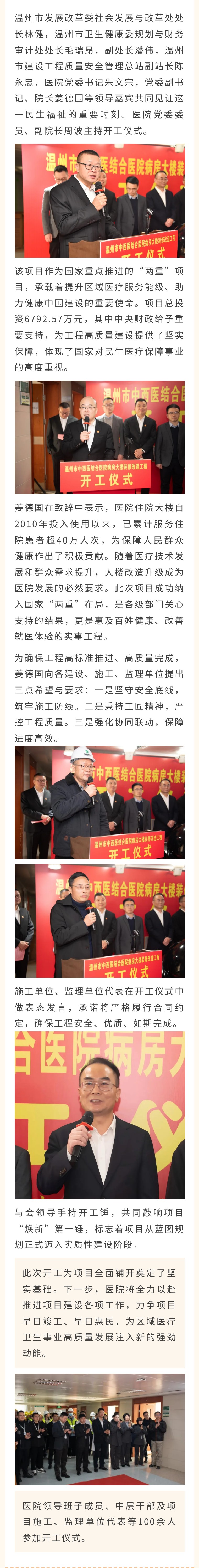 12月30日,温州市中西医结合医院举行国家重大工程、重大项目(“两重”项目)病房装修改造工程开工仪式。温州市卫生健康委党委副书记(专职)林晓江出席并宣布项目开工。