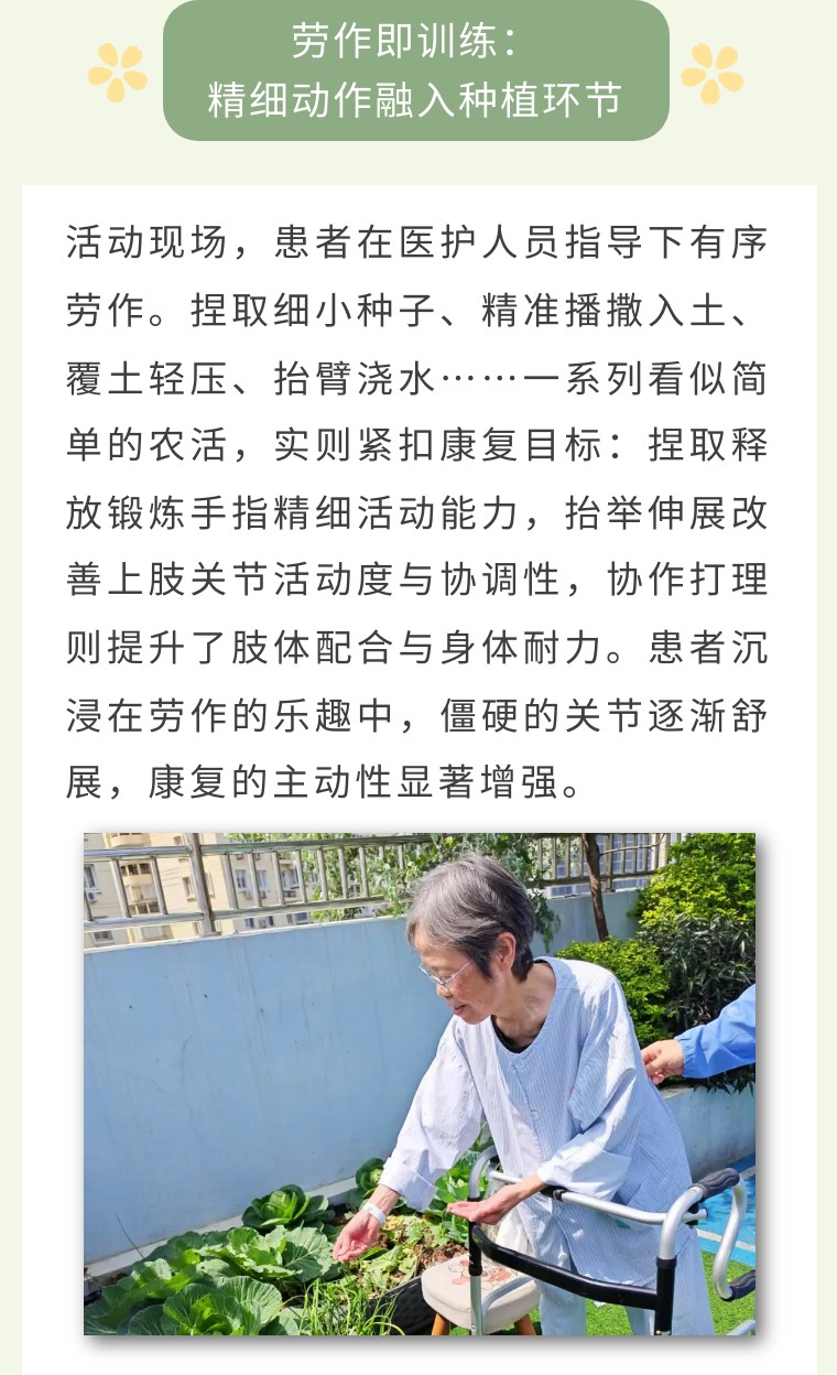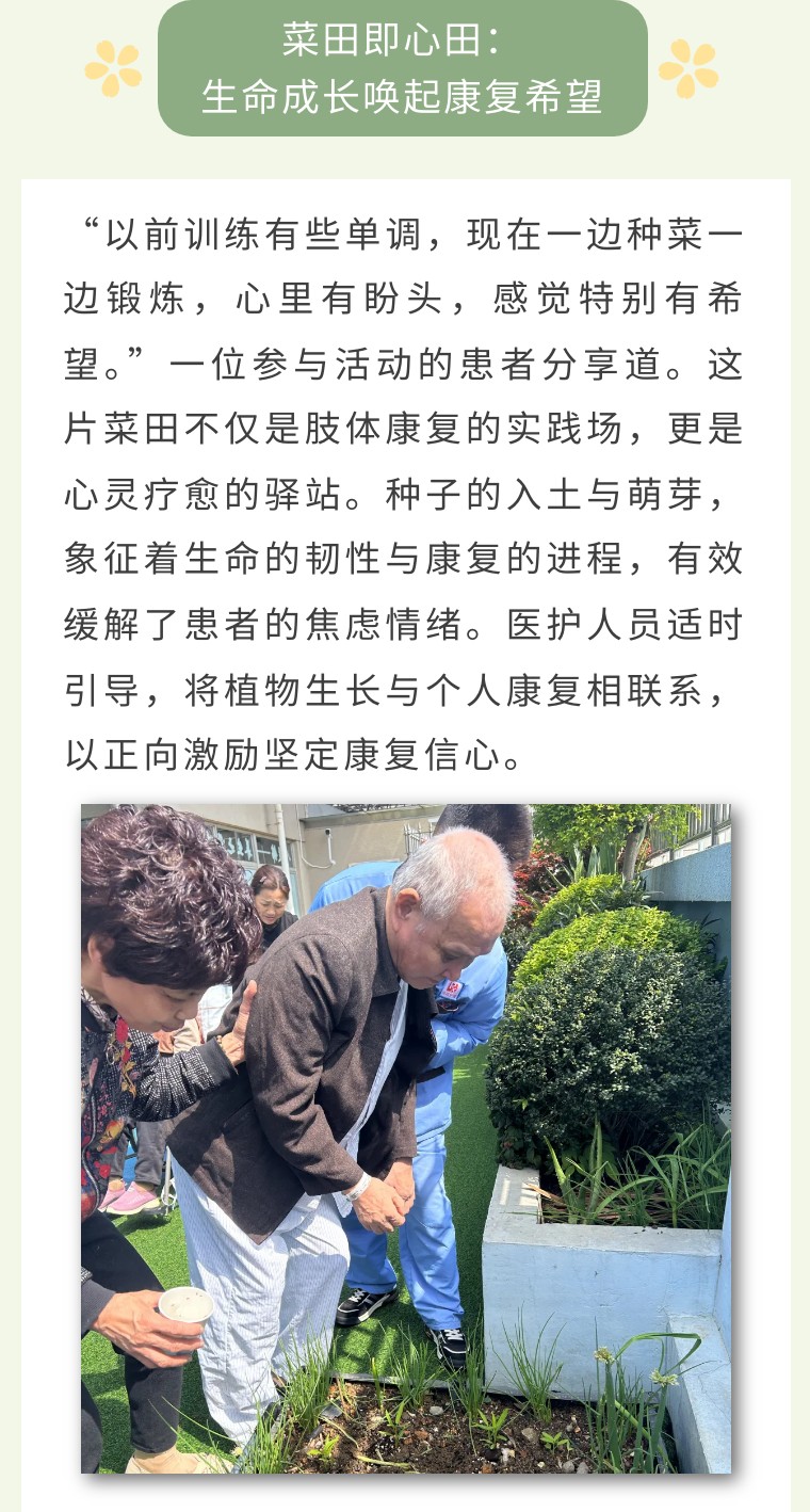 春日和暖,万物复苏。近日,温州市中西医结合医院康复科创新康复模式,将功能训练融入田间劳作,组织住院患者在科室专属的“共享菜田”中开展特色种植活动。通过亲手播种蔬菜与凤仙花种子,患者在指尖的精细操作与肢体的协调运动中完成康复训练,于躬身耕耘间播撒下康复的希望。