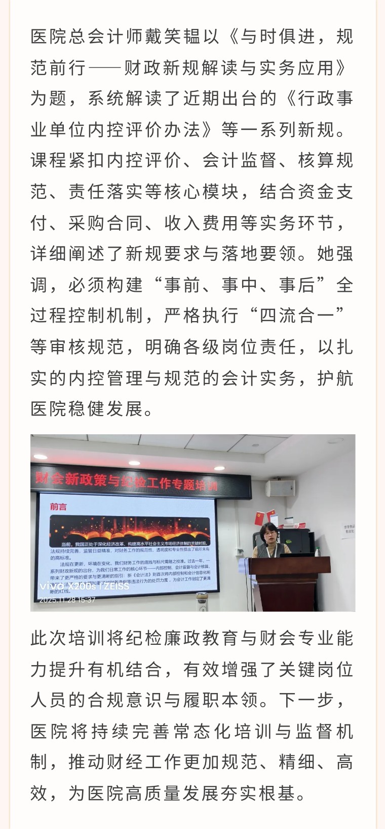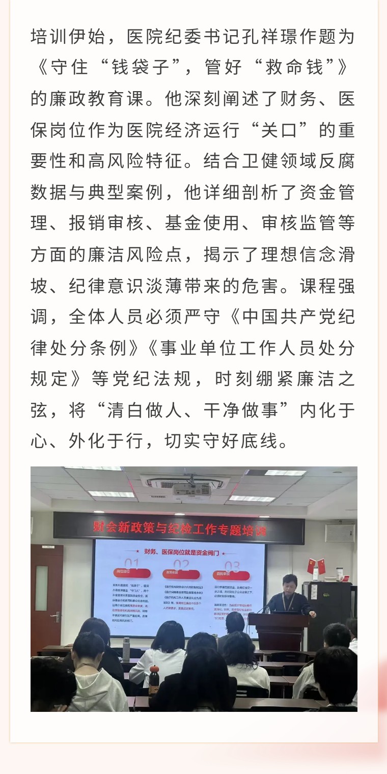 2025年11月28日,温州市中西医结合医院成功举办财会新政策与纪检工作专题培训,旨在精准把握财经政策新要求,强化关键岗位廉洁风险防控能力,保障医院资金与医保基金安全规范运行。医院财务科、医保办、运营与绩效管理科全体在岗人员参加培训。